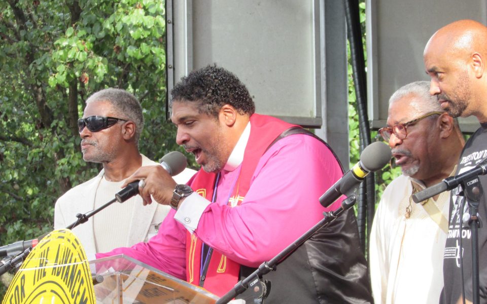 “We need to remember that these rights were won by blood,” Barber said. “Blood yesterday, and blood today.” Then, invoking the assassinations of the Rev. Martin Luther King Jr. and Malcolm X, along with the massacre of nine parishioners in Charleston, SC last month, Barber asked, “How dare someone try to desecrate the blood of our martyrs?”