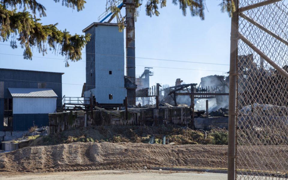 Featured photo: A portion of the ruins of the Weaver Fertilizer plant in Winston-Salem. It caught fire on Jan. 31. This photo was taken Feb. 6, and the material was still smoldering. (photo by Lisa Sorg)