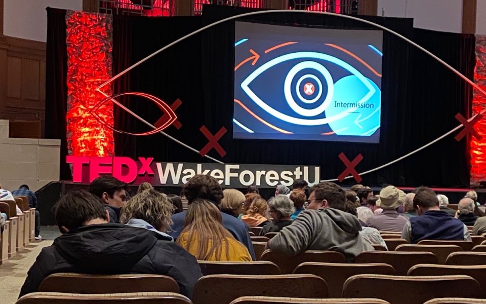 his microphone. His eyes scan across the Wake Forest University Wait Chapel building,