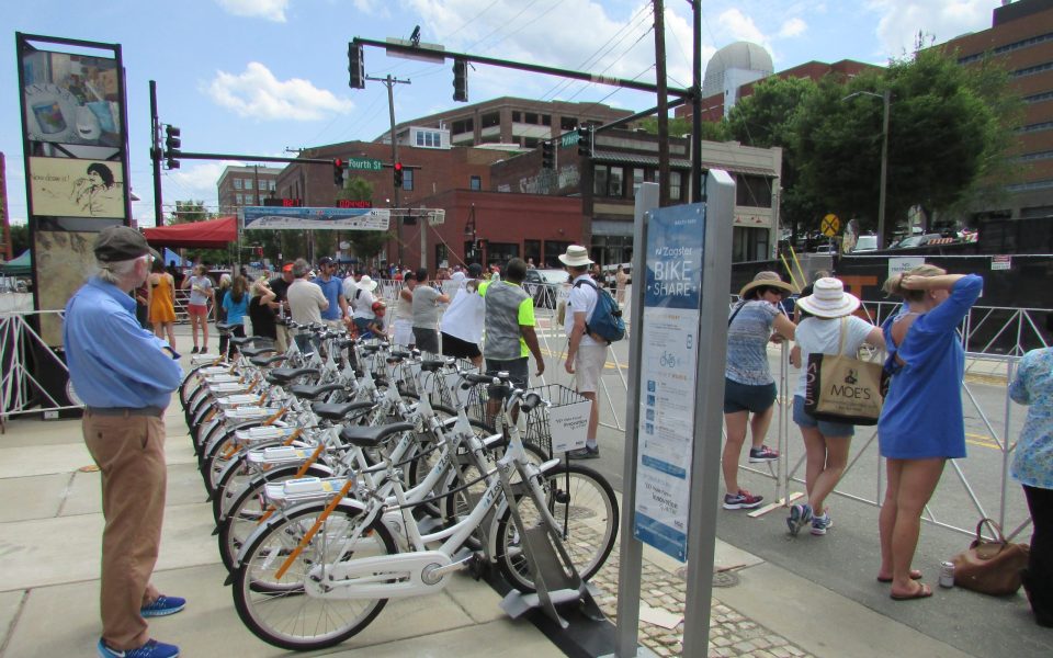 Taking care to avoid the racers, I made my way to the Fourth and Trade Street station. I found Ben and Lindsey Schwab checking out bikes to follow the race. They had taken out bikes previously when the service was launched on May 26, and were looking forward to becoming regular users.
