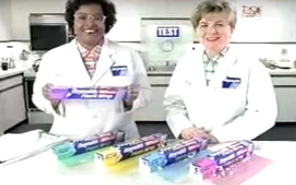 Morton and Pat Schweitzer, the Reynolds Kitchen home economists, were known in the ‘90s for starring in commercials featuring full, home-cooked meals wrapped in aluminum foil. The ads featured G-rated slapstick comedy that usually involved Pat conducting experiments while Betty penned the results on a clipboard. One commercial promoting Reynolds Crystal Color Plastic Wrap begins in a sterile, white test kitchen and moves to the front porch of a house. In the next scene, Morton presents a plain zucchini bread in a pan while her partner, Pat presents another zucchini bread swaddled in yellow cellophane with a plume of golden-hued ribbon eliciting an excited response from an off-camera voice over. A 10-second presentation of a pink packaged cake, a green bundled Easter basket and a tray of pastel-sheathed bundles all end in Pat and Betty wearing pastel-dyed lab coats in a pastel-colored test kitchen.