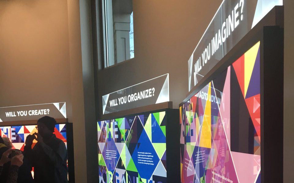 Inside the first room, colorful triangles surround wall displays, each with information on local community organizations like the Women’s Resource Center of Greensboro or Neighborhood Congress.