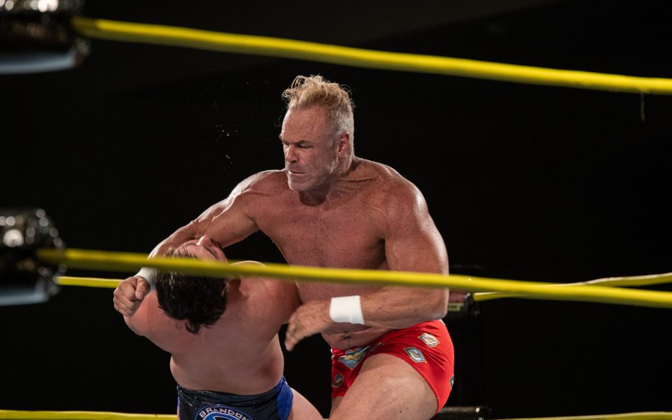 The man in the tiny purple shorts scurried around the ring while gesturing at the guy walking towards him. Compared to Brandon Scott who seemed small and slightly frightened, wrestler Billy Gunn was built like a Greek statue and looked like he could eat Scott as a snack as he approached the ring. Gunn’s appearance marked the opening match on Saturday or Day 2 of Wrestlecade in Winston-Salem. The well-known WWE wrestler — who found fame in the late nineties and early 2000s with partner Road Dogg as part of a tag team known as the New Age Outlaws — looked older, his face significantly more lined than in his heyday, but the bulging muscles that clustered around his shoulders suggested he still had what it takes to own the ring. Gunn, who stood over six feet tall, stepped into the box and began pacing around, hunting Scott, who seemed like a foot shorter than him.