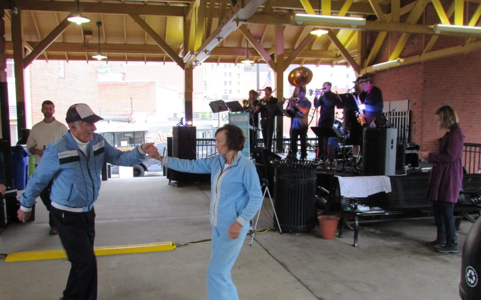 Boom Unit Brass Band, which kicked off the season on May 20, had the task of energizing a small but enthusiastic crowd — those who were willing to brave the light mist and occasional spitting rain. On the upside, there was free curbside parking on Main Street, with capacity to spare, less than half a block from the venue. Those who turned out quickly discovered the upper deck of the station was amply sheltered, the Zeko’s Pizzeria & Grill food truck parked nearby on the street, wine and beer available for purchase, and the band hot.